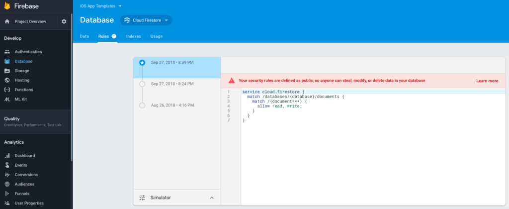 In order to allow the mobile app to read and write data to/from Firebase Firestore, we need to set up the correct access permissions. To do that, just head over to Database -> Cloud Firestore and set the Rules for writes and reads to public.