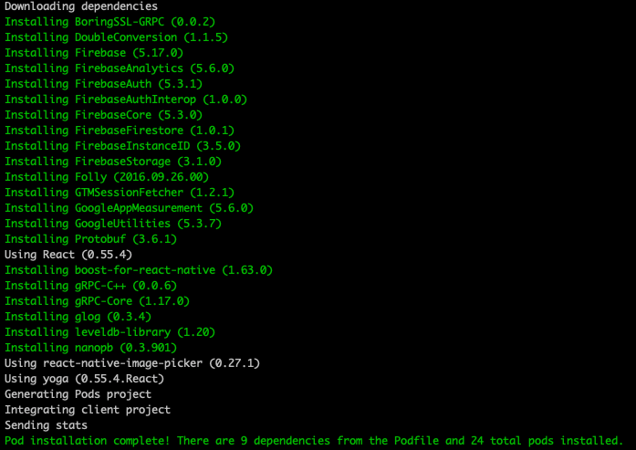 This will install all the pods that the Flutter app depends on, such as Firebase Auth, Storage, etc. Make sure you have Cocoapods installed beforehand. Here’s how a successful output looks like: