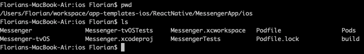 ios folder). Also make sure a Pods folder got generated, otherwise the build won’t work. - In Xcode, select the iOS simulator / device and build and run the app ( Command + R)