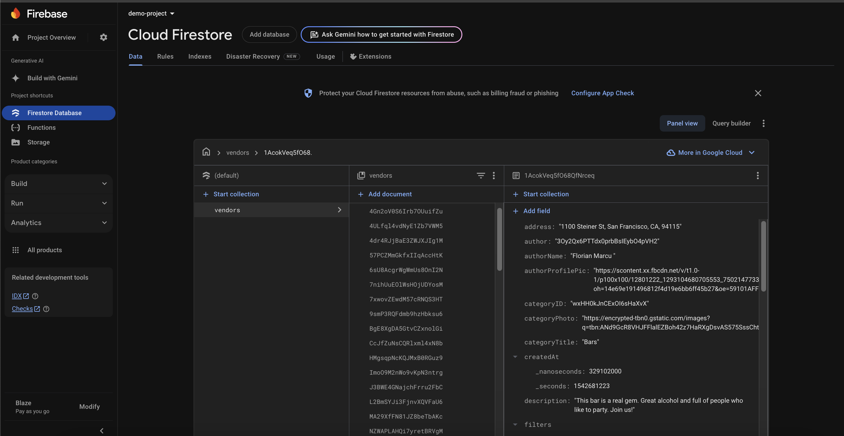 Great Job! You have sucessfully seeded your firebase with our seed data. Go ahead to your firestore to see the imported datas. You should find new data inserted: