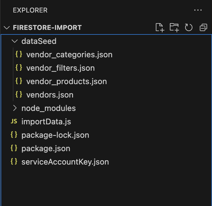 Next go ahead and import our seed folder. (usually name dataSeed having json files inside it). Next we will go ahead and add the npm package we need to seed our firebase.