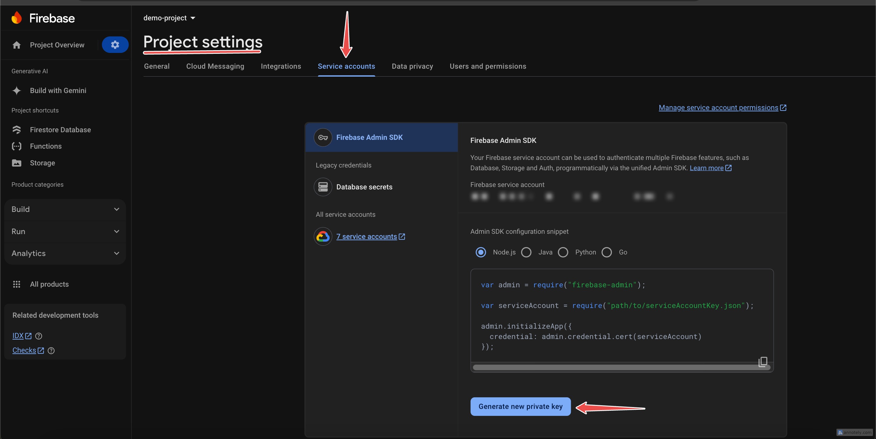 Rename this downloaded file to serviceAccountKey.json and put it in the root of the project we created above (firestore-import).